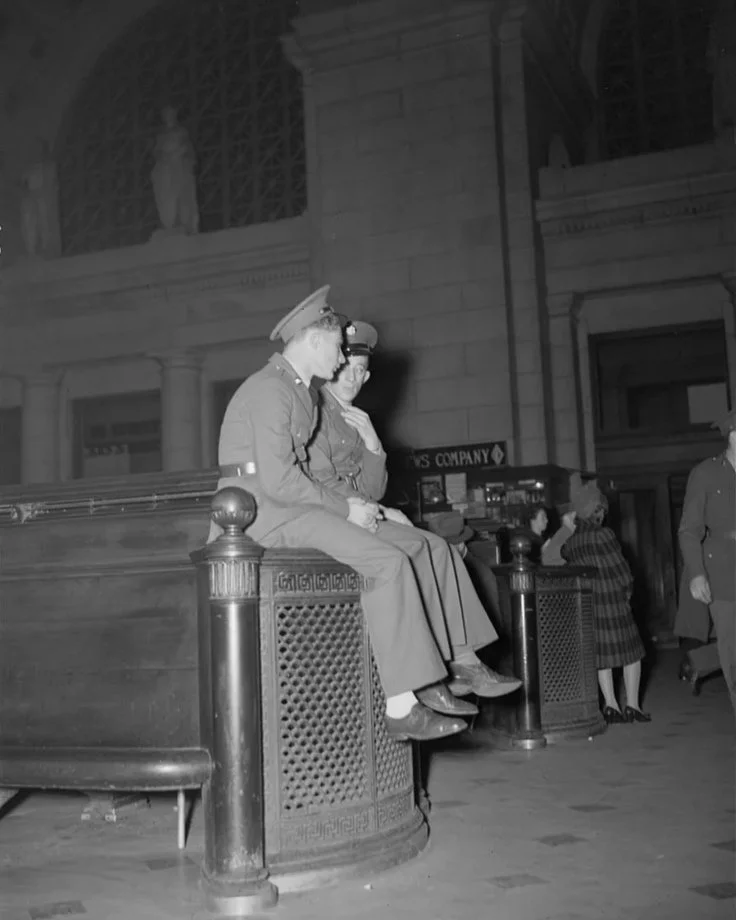 Two U.S. soldiers sit quietly inside Washington, D.C.’s Union Station in November 1942, waiting for a troop train during the height of World War II. Their pause reflects a common moment in wartime travel, when service members moved through major rail hubs on their way to training or deployment. Union Station served as a critical transit point, connecting the capital to military installations across the country, as the nation mobilized millions for service at home and overseas.