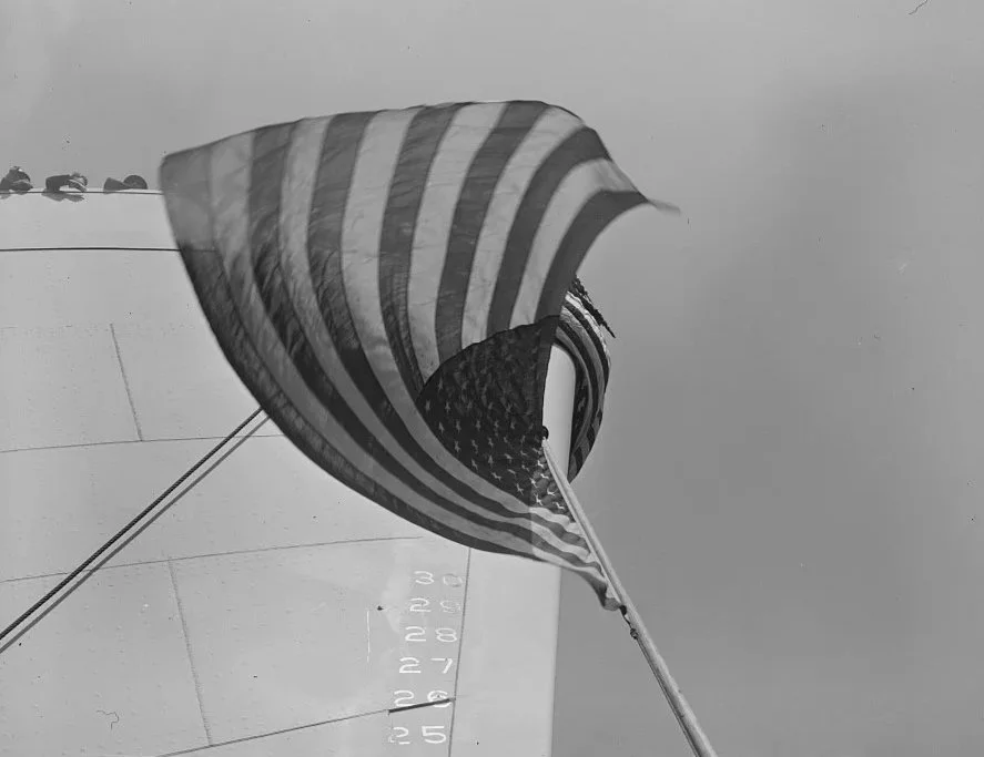 An American flag hangs over the bow of a newly built Liberty ship at the Bethlehem-Fairfield shipyards in Baltimore in 1943, just before its launch. These vessels were produced in large numbers during World War II to carry troops, supplies, and equipment across the Atlantic, forming a critical link in the Allied war effort. Shipyard workers and assembly-line methods allowed for rapid construction, symbolizing the industrial scale and urgency of wartime production on the home front.